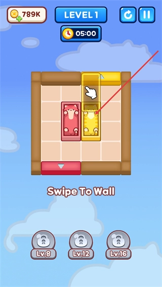 当前游戏界面正显示“SwipeToWall”提示,你需要按照指引滑动对应的区域,以此来移动猫咪方块,从而完成关卡内的匹配操作。