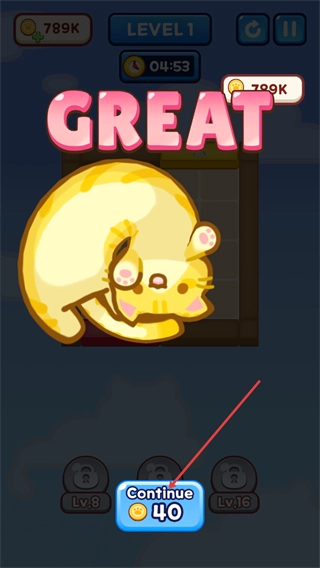 完成关卡后会出现“GREAT”的通关提示,点击Continue按钮领取金币奖励,就能继续挑战下一个关卡。