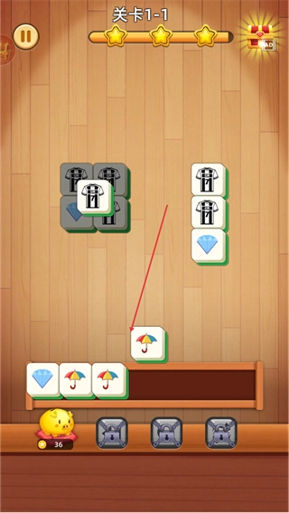 在关卡1-1里,把雨伞这类相同图案的方块匹配起来,通过消除方块来积累积分,以此推进关卡进度。