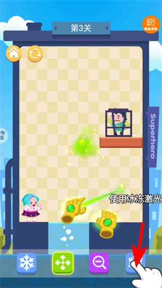 进入第3关后,按照红色箭头的指引行动,点击冰冻激光道具来激活冰冻能力,以此为后续搭建救援路径做好准备。
