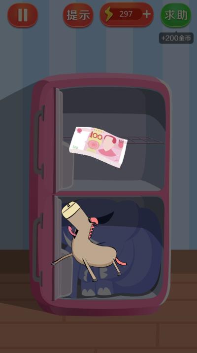 第2关也说不上什么通关技巧,小编试了N次,无论你怎么开,先开冰箱上层还是下层,先出来的都是大象,所以唯一的办法就是把冰箱都打开就能看到钱了。