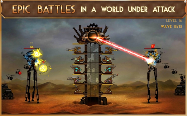 游戏走的是复古的朋克风路线,为了体现复古二字,整体画面采用昏黄的色调打造,由机械钢铁风味浓厚的建筑构成,远处渐渐淡去的风景,有点古老水墨画的味道,真枪实弹的特效做的非常带感,一波波入侵的敌人造型其实也就是大家熟悉的火柴人,略为简陋。