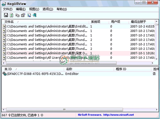 RegDllView 可以显示出你的电脑里所有已注册的dll, ocx, exe组件(COM 注册),在每个已注册的文件中,你可以查看它的最后注册日期,CLSID和ProgID等.还可以以粉红色来显示已注册但丢失的源文件,可以点右键来注册和反注册模块. 特别是在安装某程序后没有卸载干净的注册模块,可以很方便地清理注册表垃圾无用的CLSID组件垃圾.RegDllView 是独立的程序,不需要安装,你可以在任意文件夹里运行它