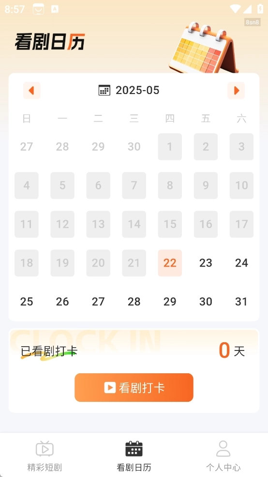 2、在看剧日历页面可完成看剧打卡操作,帮助你知晓自己累计看剧的天数。