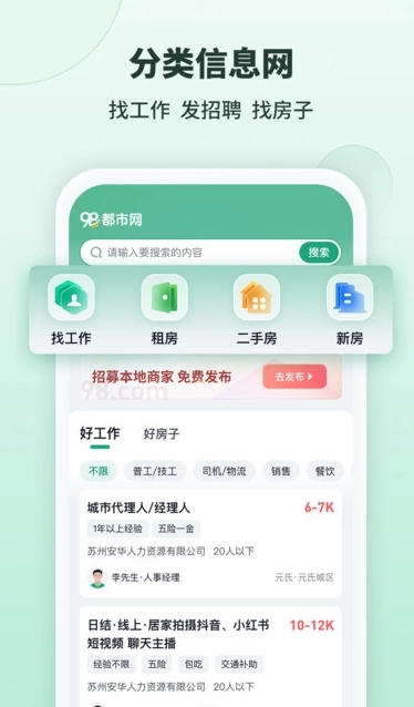 98都市是专为本地用户打造的同城生活服务平台,涵盖了丰富多样的服务类别。用户可以在这里便捷地找到合适的工作机会,也能轻松结识志同道合的朋友,还能随时在线完成租房找房的需求。总而言之,各类同城生活服务都能在98都市中找到,满足用户的日常所需。