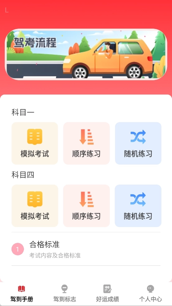 1、在驾到手册里设有科目一与科目四的模拟考试、顺序练习以及随机练习板块;