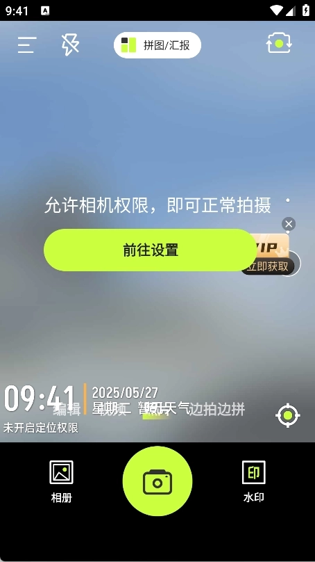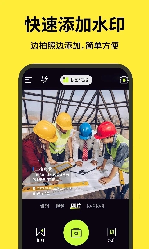 1、打开软件后,在首页就能选择水印模板进行拍照,同时还支持视频拍摄以及边拍边拼的功能;