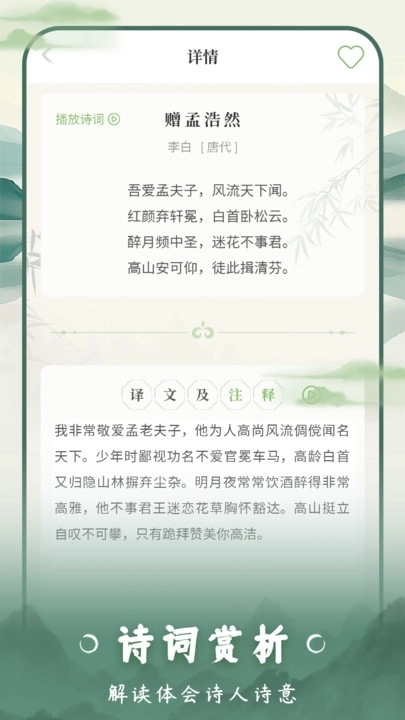 1、每个清晨,App都会推送一首经典诗词,同时附上详尽的解析与背景故事,让用户即便身处忙碌的生活里,也能领略诗意人生的韵味。