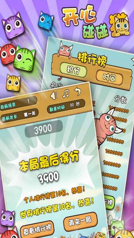 开心碰碰猫是一款不错的益智类型的游戏,游戏的画面设计得比较可爱,生动形象,视觉效果很不错,绝对能吸引玩家的眼球。在2消游戏中绝对是一款靠创意的扛鼎之作,创造性地将时间要素,积分翻倍功能以及运气成分结合在一起推出的休闲游戏,绝对值得一试。基本玩法非常简单,点击两个相连的同色猫咪即可消除,但是,同时消除的猫咪越多,奖励越丰厚,积分也就越多。喜欢的玩家可以试试哦。