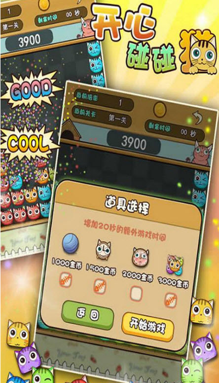 《开心碰碰猫》还推出了4个免费的道具,您可以有效地使用道具来提高您的分数哦!加油吧,让我们一起来享受《开心碰碰猫》的快乐!