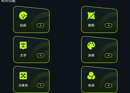 2、界面的功能划分十分细致,配备了裁剪、贴纸、文字、涂鸦、色调调节等丰富多样的功能选项。
