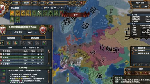 4.国土过度扩张,超过100,铁定经常叛乱,最好控制50以下,就是说打完,对方割让行省,一般拿2个就是控制在50左右,如果割让的行省你也有核心要求,就能降低过度扩张,造假的时候到了。转变成核心行省后,就能消除过度扩张和叛乱风险了。