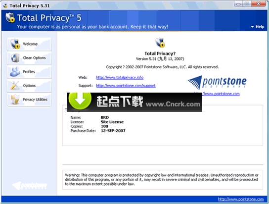 Pointstone Total Privacy V5.72.380 英文绿色特别版 Total Privacy通过清除浏览器和系统中的痕迹来保护你的个人隐私。它能清除浏览器的缓冲区、删除从网上得到的数据等等。例如:Cookies, history, index.dat,这些位置都包括了你的私密信息,使用Total Privacy可以自动清理它们,免除被居心不良者利用的担心。Total Privacy支持以下浏览器:Internet Explorer, Netscape, Mozilla, Firefox, Opera, AOL。