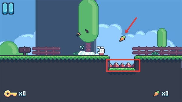 在关卡场景里,碰到【尖刺】陷阱时,【点击屏幕】就能让兔子跳跃避开陷阱,还能顺手收集【胡萝卜】道具。