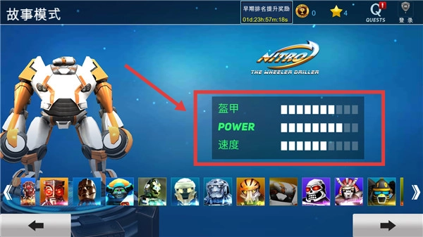 在机器人选择界面,查看并挑选拥有不同【盔甲】-【POWER】-【速度】属性的机器人,为接下来的战斗做好准备。