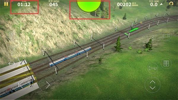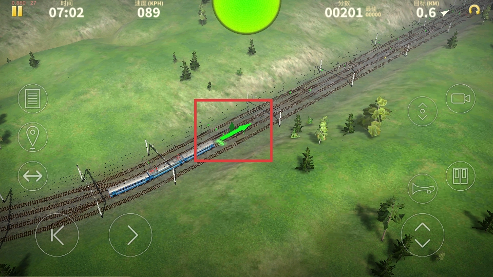留意界面左上角的时间与速度显示区域,通过操作左侧的操控按键,引导火车顺着轨道朝着绿色箭头所指示的方向前进。