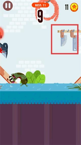 当得分达到【9】分的时候,要避开右侧悬挂着的【刀具】障碍物,并且离左侧的危险区域远一些,继续推进关卡进度。