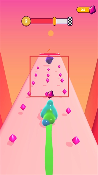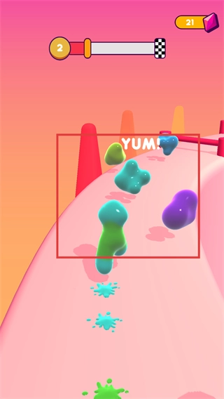 控制角色在粉色路径上收集彩色黏液,逐步向关卡目标推进,积累成长进度。