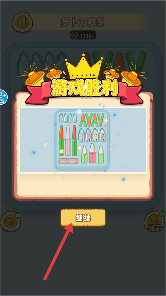 完成萝卜刀收纳任务后,界面会显示【游戏胜利】,点击【继续】按钮就能进入下一个相关关卡或环节。