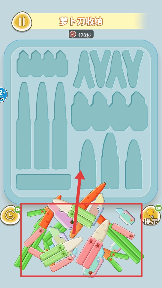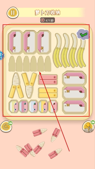 在【萝卜刀收纳】关卡里,需要把散落各处的萝卜刀依据形状匹配到对应的凹槽中,把所有位置都正确放置好就能推进关卡进度。