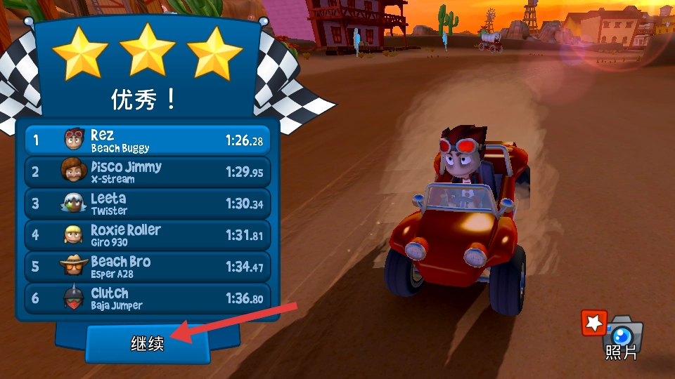 比赛结束后,你可以查看排名情况,点击【继续】按钮,就能接着进行挑战。