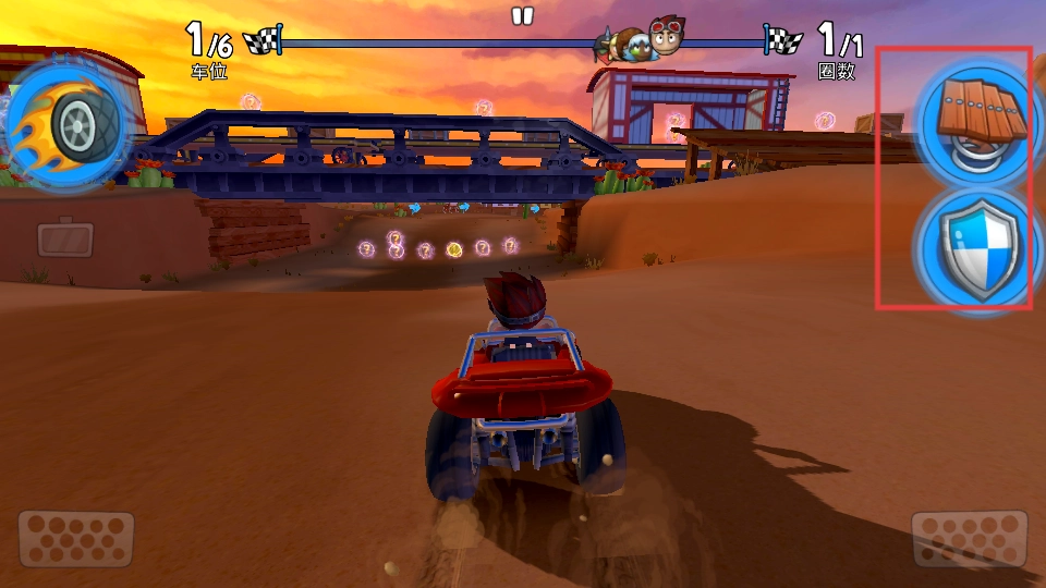 在沙漠赛道驾驶赛车时,可通过两侧的操作区域来控制方向与速度,并依据赛道标识调整行驶路线。