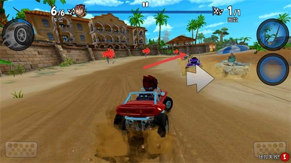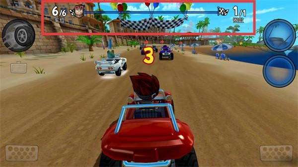 屏幕上方显示的“6/6 车位”指的是当前的排名情况(总共有6名参赛选手),而“1/1 圈数”则代表当前所处的赛程圈数。