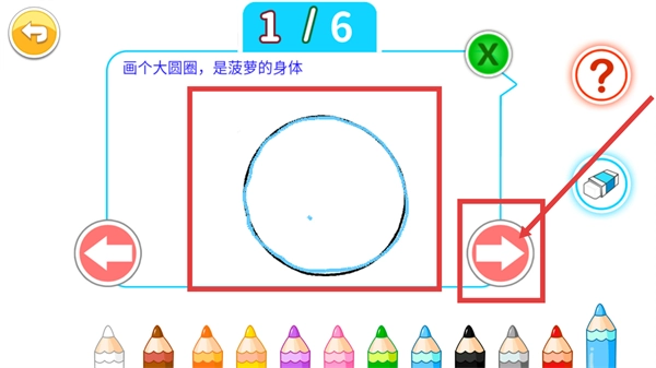 进入关卡后留意提示【画个大圆圈作为菠萝的身体】,先挑选合适颜色的画笔,然后在框内画一个大圆圈就可以啦。