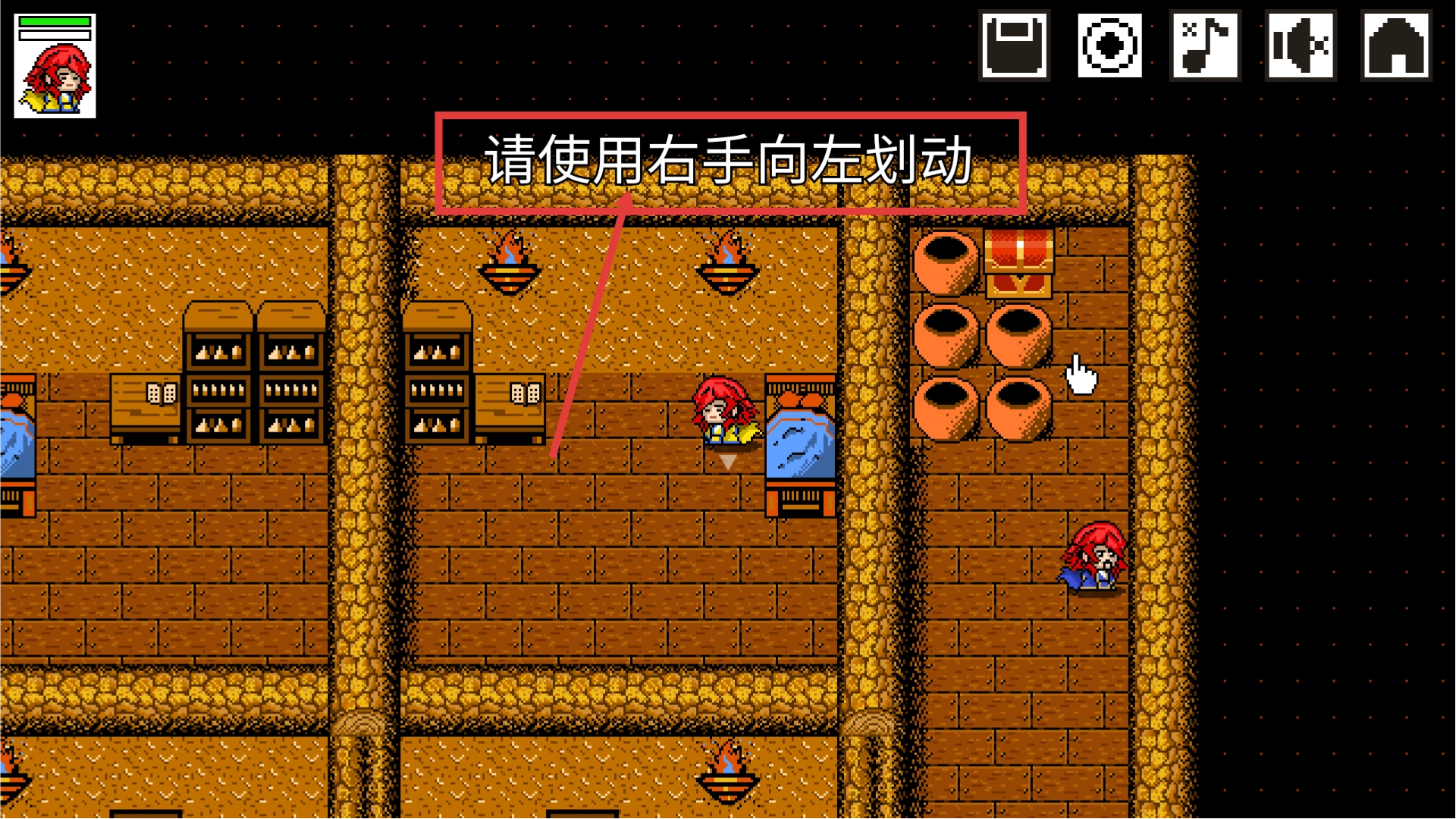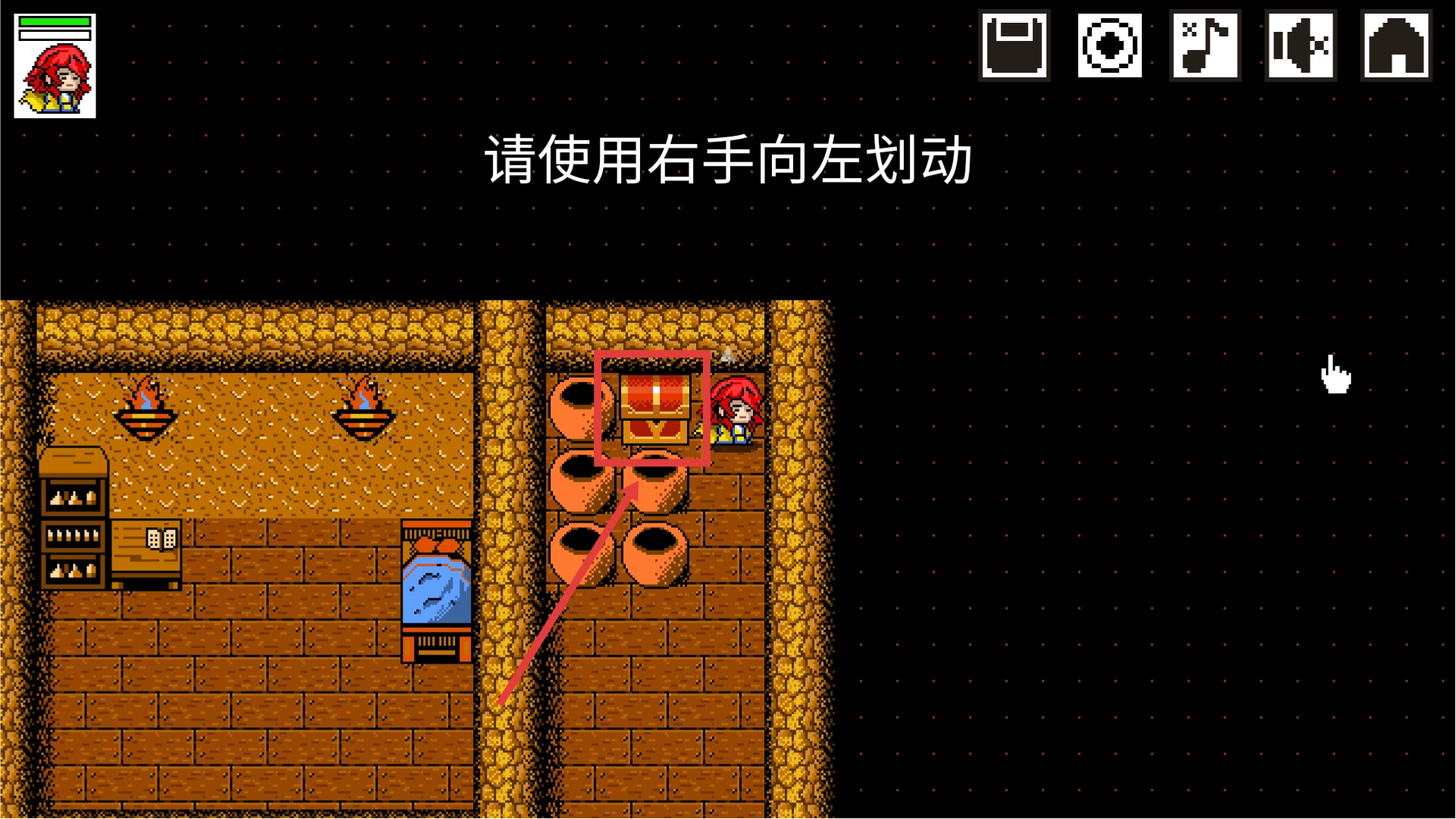 在房间里按照提示,用右手向左滑动屏幕,就能探索到更多区域,还能找到【宝箱-陶罐】之类的道具来帮助冒险。