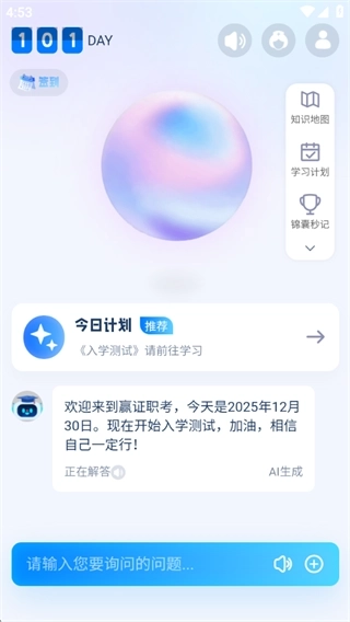 2、主界面整合了智能问答功能模块,考生能够随时提交备考过程中遇到的疑问,并获取专业的解答。
