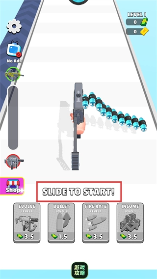在关卡界面滑动屏幕,即可触发【SLIDETOSTART!】指令,进而进入Level1关卡;与此同时,枪支进化、子弹等级等功能也将同步解锁。