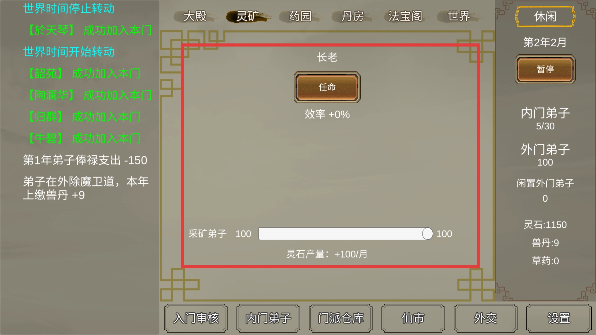 在门派界面中,通过任命【长老】能够有效提升各项事务的处理效率;同时合理设置【采矿弟子】的数量,以此保障每月【灵石】产量的稳定,为门派后续的发展持续积累所需资源。