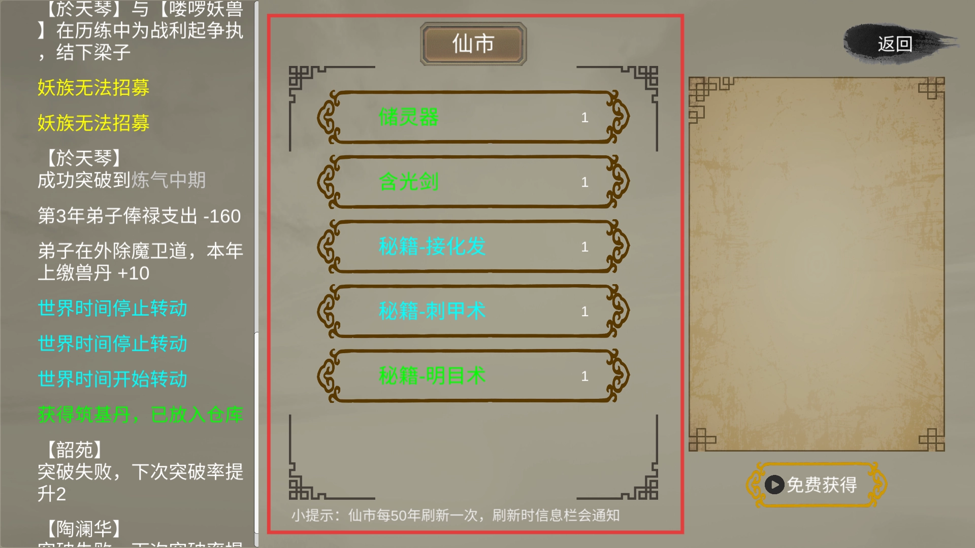 进入仙市界面选购储灵器、含光剑等各类道具,以此增强门下弟子的实力,需要留意的是,仙市每隔五十年便会刷新一批全新的物品。