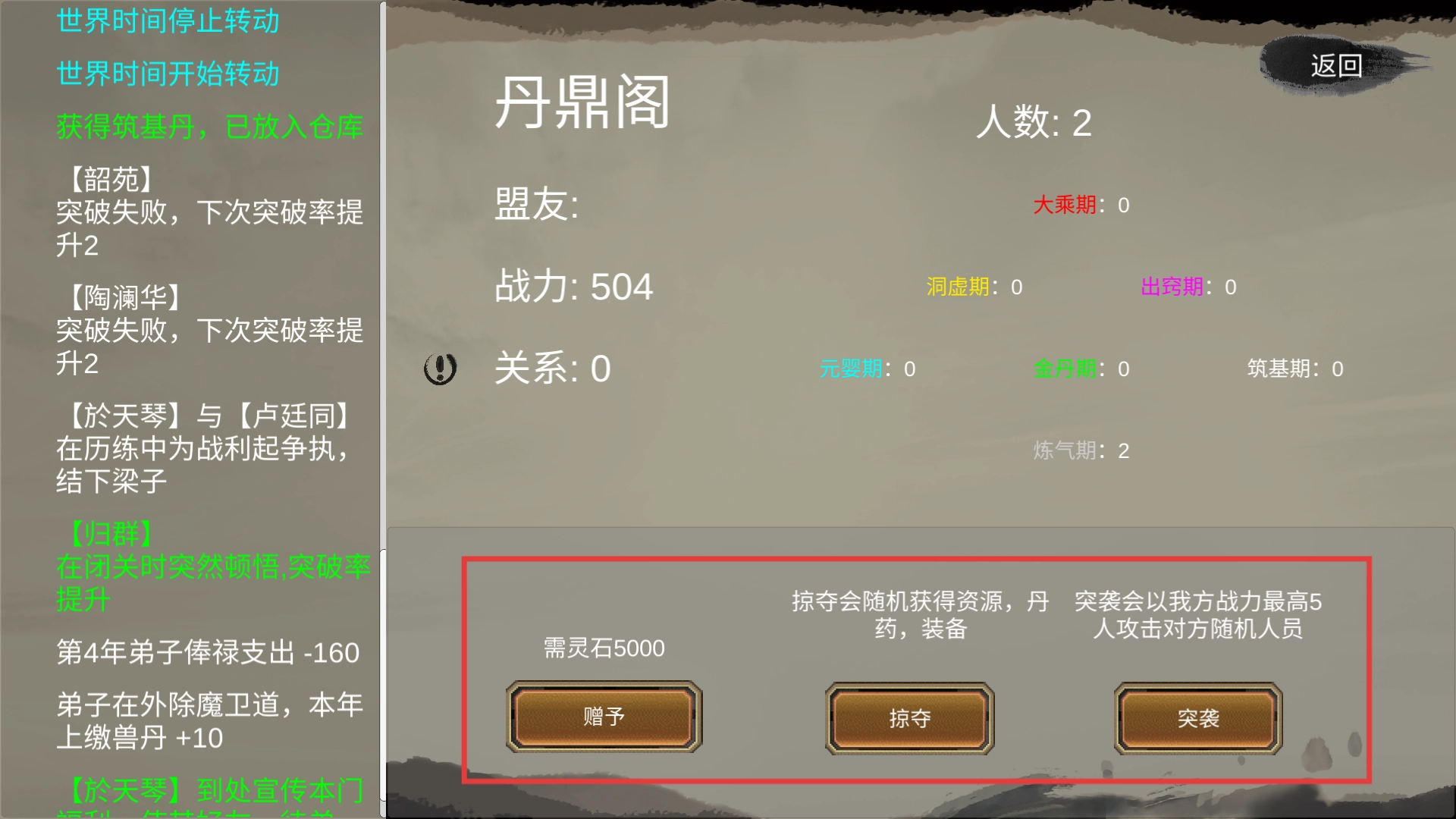 在【丹鼎阁】可通过【赠予】来增进门派关系,也能借助【掠夺】-【突袭】获取资源,建议依据自身战力进行合理操作。