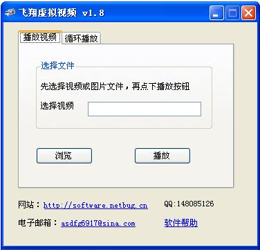 点下“浏览”按钮,可以选择视频文件和图片,支持的视频文件格式为wmv格式,图片为bmp和jpg,选择后,点下“播放”按钮,然后就可以在视频软件中使用了。从1.8版本开始,软件具有“循环播放”功能,就是可以选择jpg或bmp格式图片,间隔一定的时间,循环播放给对方,用户先选择要播放给对方看的图片,添加在列表里,然后在下面选择间隔的时间,最后,点下"开始"按钮,就可以按照从上到下的顺序,循环给对方播放图片了。