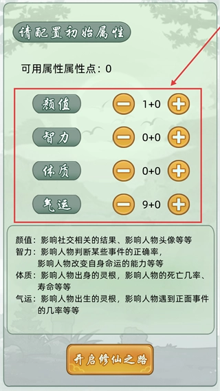 在设置初始属性时,需要调整【颜值、智力、体质、气运】这几项的数值,建议优先把气运这一项的数值调高,之后再点击【开启修仙之路】按钮。