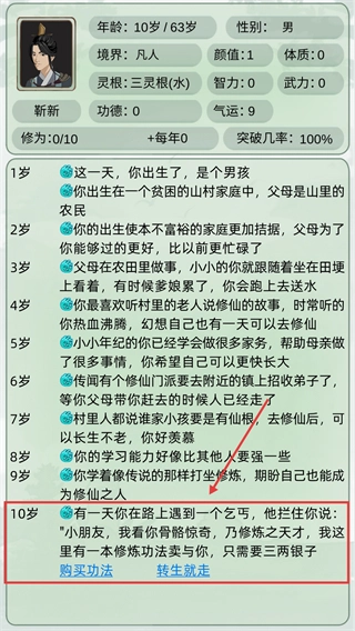10岁时遇到乞丐,选择【购买功法】来获取修炼资源,以此助力提升修为,避免错过关键的修仙机会。