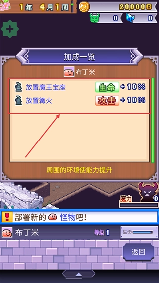 查看加成详情,摆放【魔王宝座】可增加生命值、【篝火】能提升攻击力,还能强化【布丁米】的战斗属性。