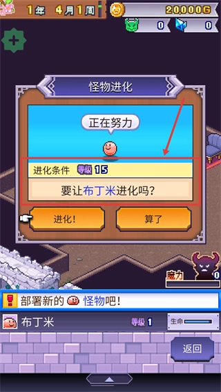 在怪物进化界面里,当【布丁米】等级达到15级时,点击进化按钮,就能完成进化并提升战力。