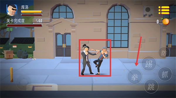 通过左侧轮盘来控制角色的移动方向,右侧的【拳-踢】等功能按钮可用于释放各类技能,以此逐步推进当前【关卡完成度-0.00】的进度条。