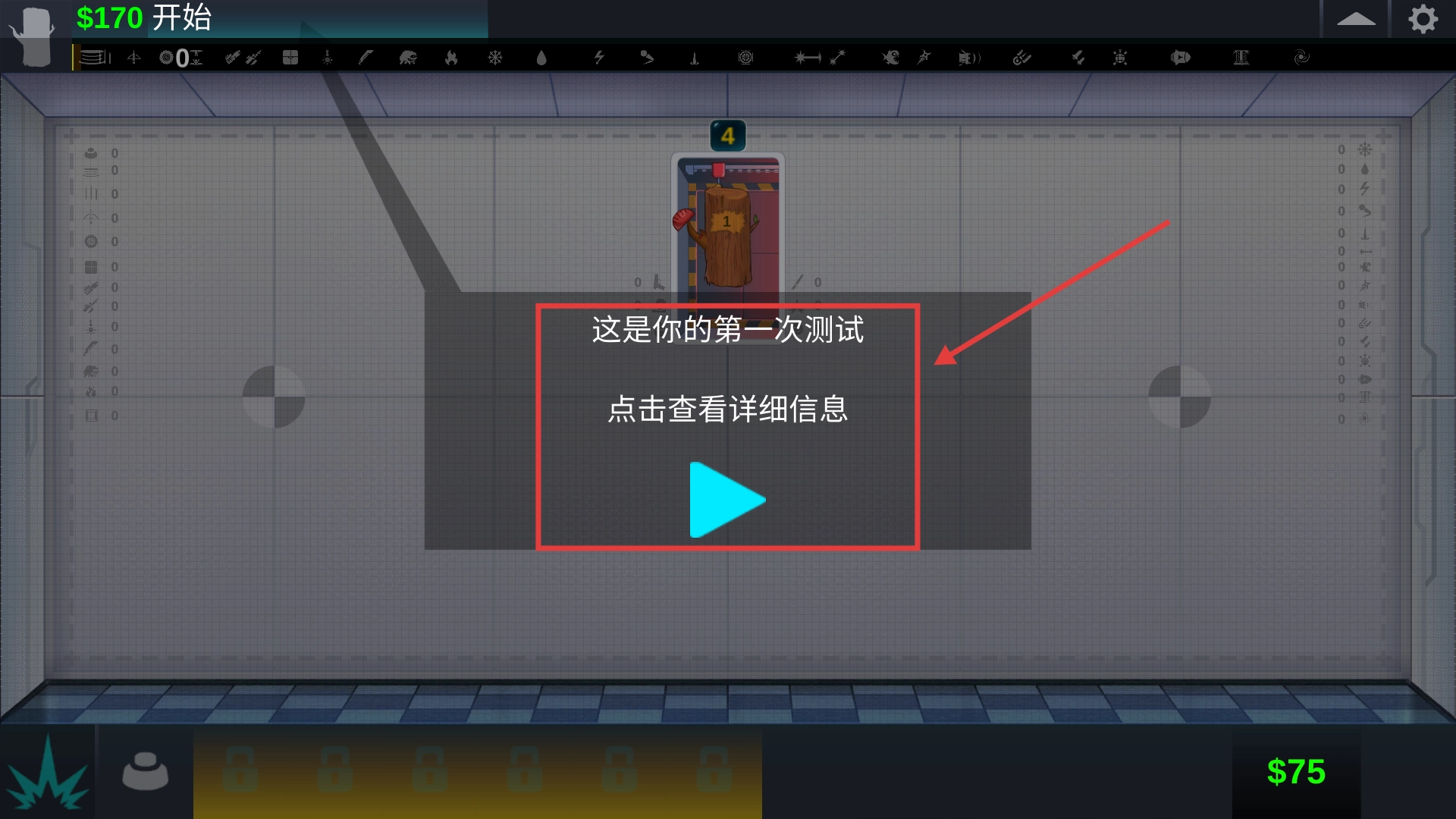 界面显示“现在开始测试-让我们开始测试”,点击该按钮后观察原木的受击情况,记录相关数据以优化武器布局。