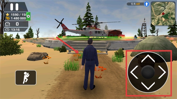 你可以通过右侧的【方向操控键】来控制角色的移动,目标是前往场景里直升机所在的区域。