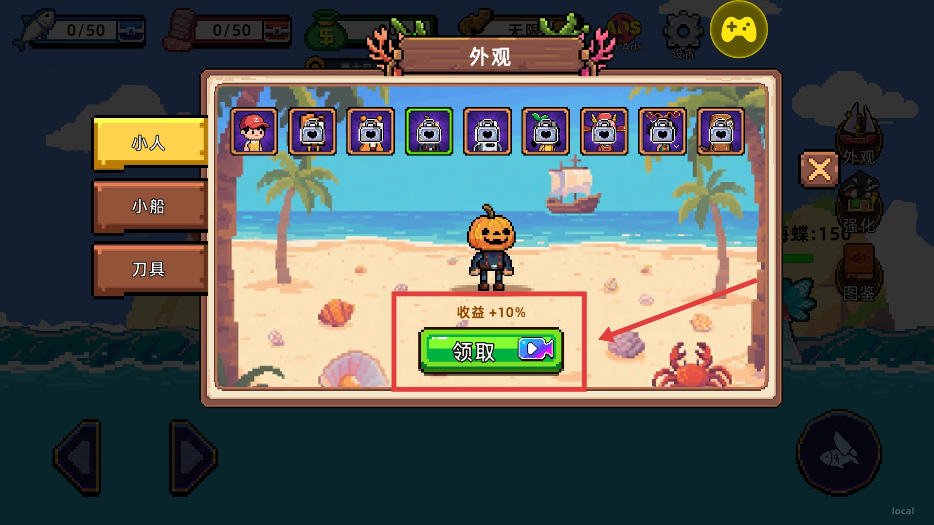 进入外观界面挑选小人皮肤,点击绿色的【领取】按钮就能得到【收益+10%】的奖励,为钓鱼进程提供助力。