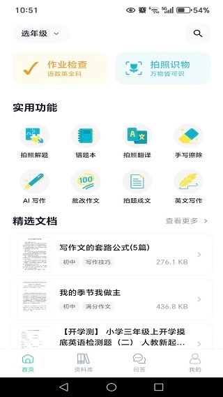 1、首页整合了拍照解题与智能错题本两大功能,能助力用户快速完成作业批改并实现知识巩固