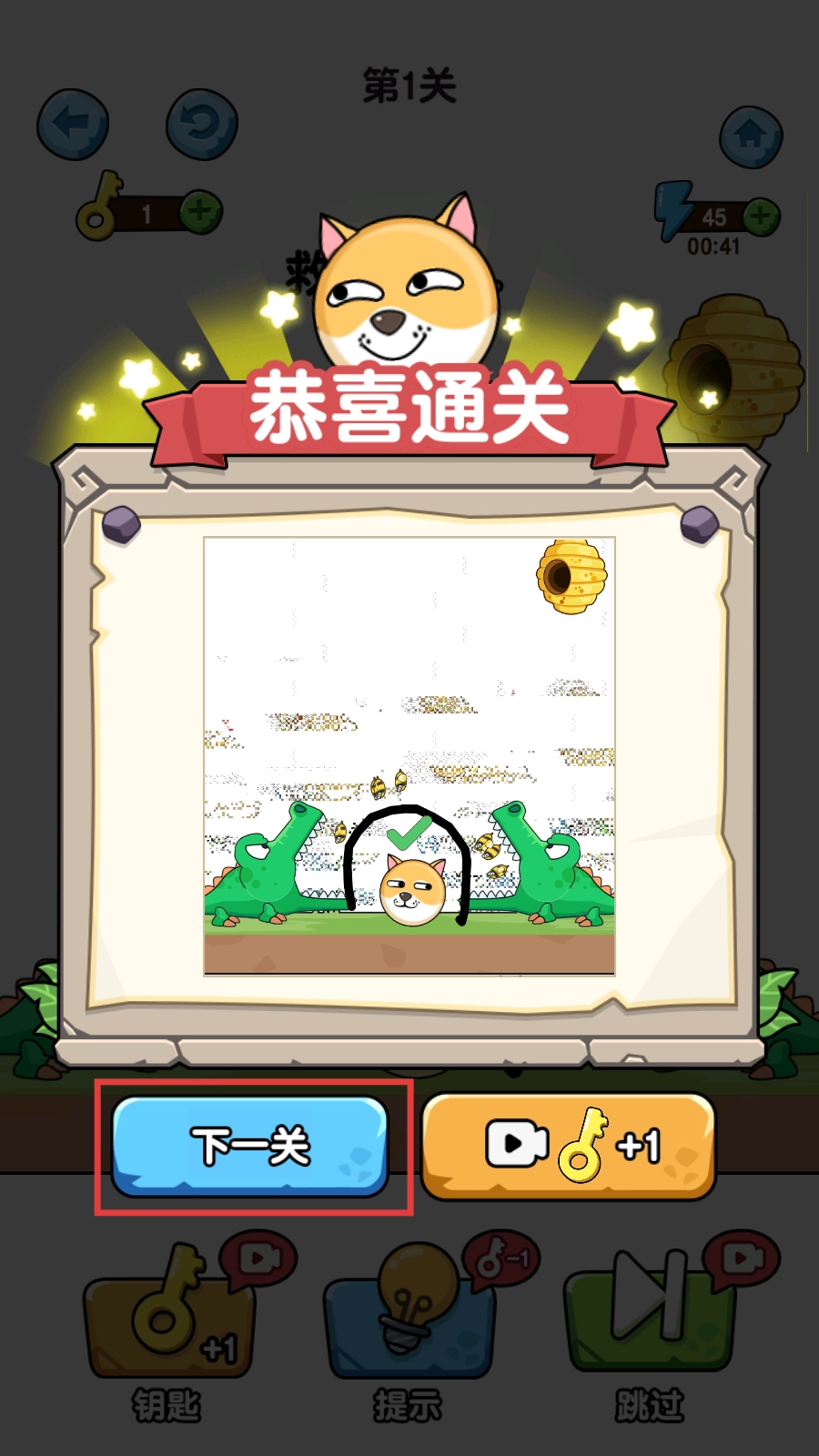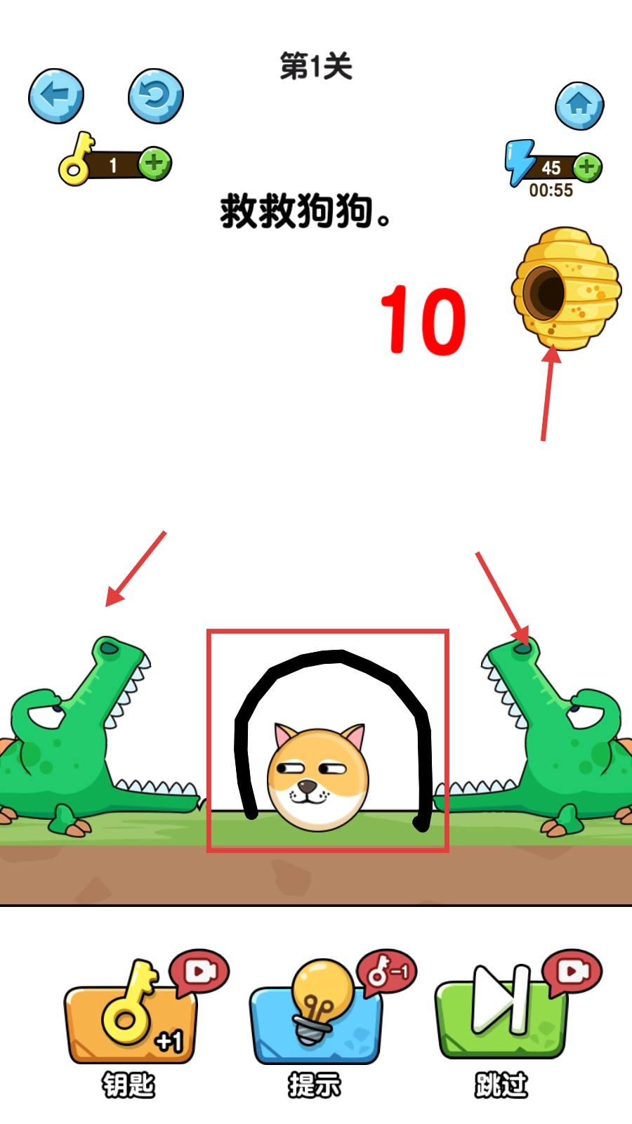 在第一关里画个黑圈把狗狗罩住,这样既能防止鳄鱼来撕咬,还能巧妙地挡住蜜蜂,然后在倒计时结束前守护好狗子的安全就行啦。