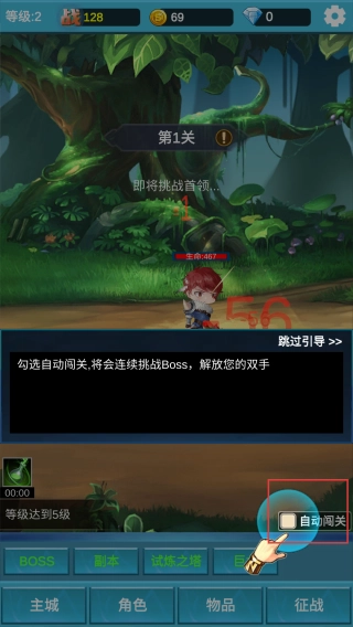 在征战界面勾选【自动闯关】选项,挑战第1关的首领,以此推进关卡进度,进而获取关卡奖励。