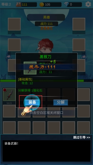 在装备界面点击【装备】按钮,穿戴【黑铁刀】,以此提升角色的战斗能力,为接下来的战斗做好准备。