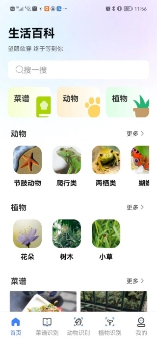 1、首页提供菜谱、动物、植物三大核心分类入口;
