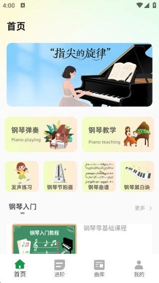 2、首页设置了多元学习板块,涵盖钢琴实操训练、发声技巧练习等核心功能