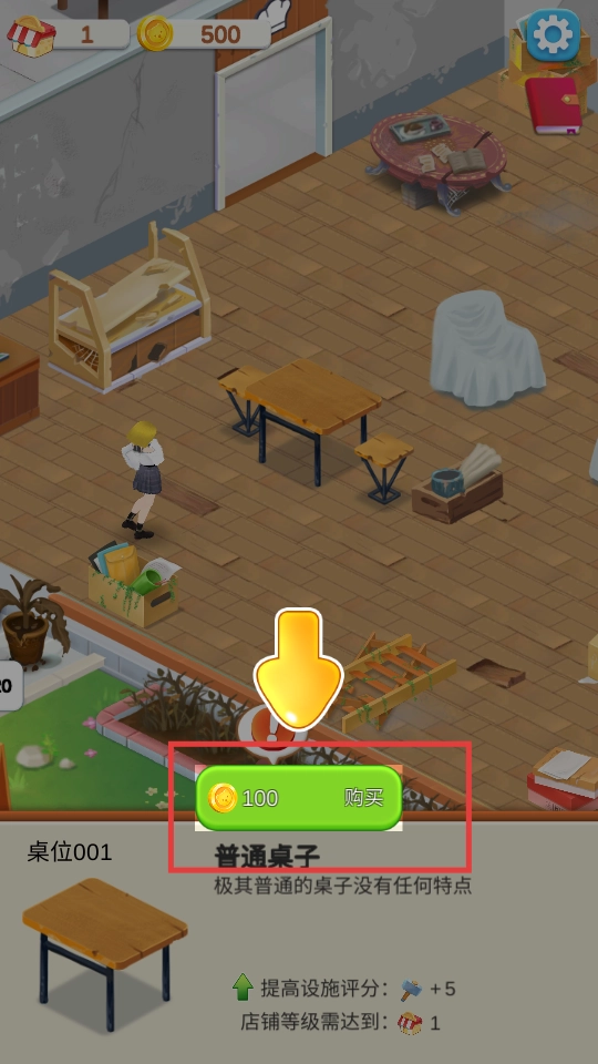 在购买确认页面,点击【100购买】按钮,消耗100金币来购买桌子。